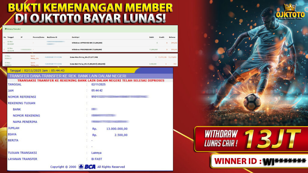 Bandar togel OJKTOTO merupakan bandar togel dan slot online yang membayar semua kemenangan member hingga lunas. Setiap pembayaran pada situs kami dilakukan dengan cara transfer ke rekening tujuan yang sudah di daftarkan pada situs togel online kami, Pembayaran hanya dapat di proses jika rekening yang di daftarkan telah valid dan dapat di transfer. Semua kemenangan member yang mendapatkan hadiah jackpot terbesar akan kami posting agar semua pemain dapat melihat bandar situs terpercaya OJKTOTO ini membayar semua kemenangan member hingga lunas. Setiap postingan yang kami posting akan kami lakukan sensor pada nomor rekening 4 digit dan nama rekening untuk menjaga privasi dan kerahasiaan member. Postingan Jackpot yang kami posting agar member atau pemain yang belum pernah bermain bisa melihat bandar togel Bukan Kaleng Kaleng Seperti OJKTOTO ini, Semua postingan jackpot yang kami posting dapat di lihat data keasliannya melalui nomor reff yang di tunjukan pada bank atau mbanking saat kita melakukan transfer