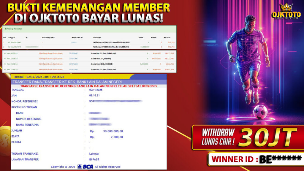 Bandar togel OJKTOTO merupakan bandar togel dan slot online yang membayar semua kemenangan member hingga lunas. Setiap pembayaran pada situs kami dilakukan dengan cara transfer ke rekening tujuan yang sudah di daftarkan pada situs togel online kami, Pembayaran hanya dapat di proses jika rekening yang di daftarkan telah valid dan dapat di transfer. Semua kemenangan member yang mendapatkan hadiah jackpot terbesar akan kami posting agar semua pemain dapat melihat bandar situs terpercaya OJKTOTO ini membayar semua kemenangan member hingga lunas. Setiap postingan yang kami posting akan kami lakukan sensor pada nomor rekening 4 digit dan nama rekening untuk menjaga privasi dan kerahasiaan member. Postingan Jackpot yang kami posting agar member atau pemain yang belum pernah bermain bisa melihat bandar togel Bukan Kaleng Kaleng Seperti OJKTOTO ini, Semua postingan jackpot yang kami posting dapat di lihat data keasliannya melalui nomor reff yang di tunjukan pada bank atau mbanking saat kita melakukan transfer