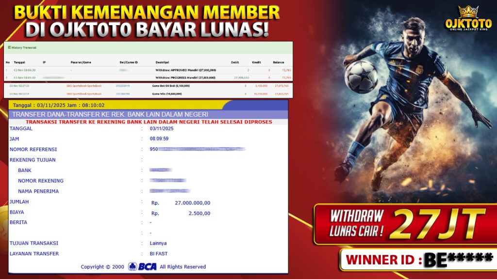 Bandar togel OJKTOTO merupakan bandar togel dan slot online yang membayar semua kemenangan member hingga lunas. Setiap pembayaran pada situs kami dilakukan dengan cara transfer ke rekening tujuan yang sudah di daftarkan pada situs togel online kami, Pembayaran hanya dapat di proses jika rekening yang di daftarkan telah valid dan dapat di transfer.  Semua kemenangan member yang mendapatkan hadiah jackpot terbesar akan kami posting agar semua pemain dapat melihat bandar situs terpercaya OJKTOTO ini membayar semua kemenangan member hingga lunas. Setiap postingan yang kami posting akan kami lakukan sensor pada nomor rekening 4 digit dan nama rekening untuk menjaga privasi dan kerahasiaan member. Postingan Jackpot yang kami posting agar member atau pemain yang belum pernah bermain bisa melihat bandar togel Bukan Kaleng Kaleng Seperti OJKTOTO ini, Semua postingan jackpot yang kami posting dapat di lihat data keasliannya melalui nomor reff yang di tunjukan pada bank atau mbanking saat kita melakukan transfer