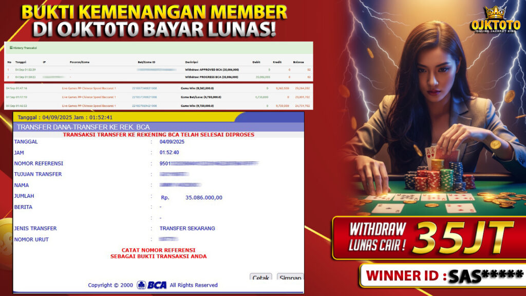 Bukti Kemenangan 04 September 2025 Di Live Games Baccarat 1 WD 35 Juta