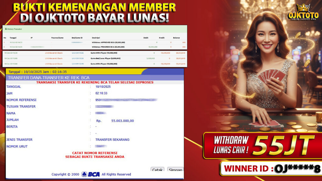 Bandar togel OJKTOTO merupakan bandar togel dan slot online yang membayar semua kemenangan member hingga lunas. Setiap pembayaran pada situs kami dilakukan dengan cara transfer ke rekening tujuan yang sudah di daftarkan pada situs togel online kami, Pembayaran hanya dapat di proses jika rekening yang di daftarkan telah valid dan dapat di transfer. Semua kemenangan member yang mendapatkan hadiah jackpot terbesar akan kami posting agar semua pemain dapat melihat bandar situs terpercaya OJKTOTO ini membayar semua kemenangan member hingga lunas. Setiap postingan yang kami posting akan kami lakukan sensor pada nomor rekening 4 digit dan nama rekening untuk menjaga privasi dan kerahasiaan member. Postingan Jackpot yang kami posting agar member atau pemain yang belum pernah bermain bisa melihat bandar togel Bukan Kaleng Kaleng Seperti OJKTOTO ini, Semua postingan jackpot yang kami posting dapat di lihat data keasliannya melalui nomor reff yang di tunjukan pada bank atau mbanking saat kita melakukan transfer.