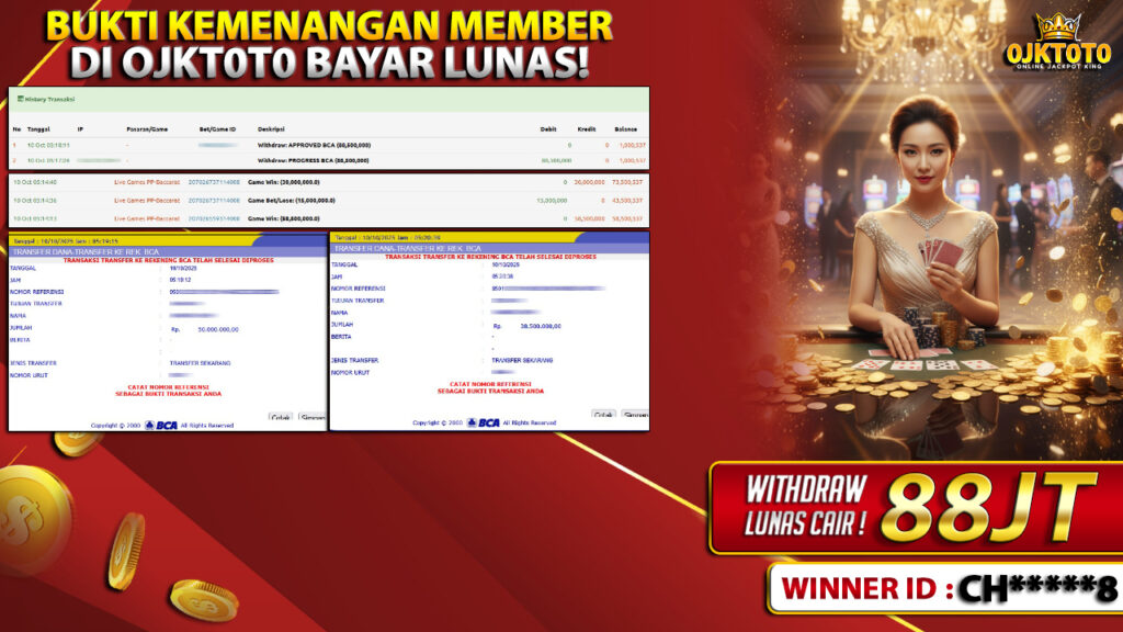 Bandar togel OJKTOTO merupakan bandar togel dan slot online yang membayar semua kemenangan member hingga lunas. Setiap pembayaran pada situs kami dilakukan dengan cara transfer ke rekening tujuan yang sudah di daftarkan pada situs togel online kami, Pembayaran hanya dapat di proses jika rekening yang di daftarkan telah valid dan dapat di transfer. Semua kemenangan member yang mendapatkan hadiah jackpot terbesar akan kami posting agar semua pemain dapat melihat bandar situs terpercaya OJKTOTO ini membayar semua kemenangan member hingga lunas. Setiap postingan yang kami posting akan kami lakukan sensor pada nomor rekening 4 digit dan nama rekening untuk menjaga privasi dan kerahasiaan member. Postingan Jackpot yang kami posting agar member atau pemain yang belum pernah bermain bisa melihat bandar togel Bukan Kaleng Kaleng Seperti OJKTOTO ini, Semua postingan jackpot yang kami posting dapat di lihat data keasliannya melalui nomor reff yang di tunjukan pada bank atau mbanking saat kita melakukan transfer