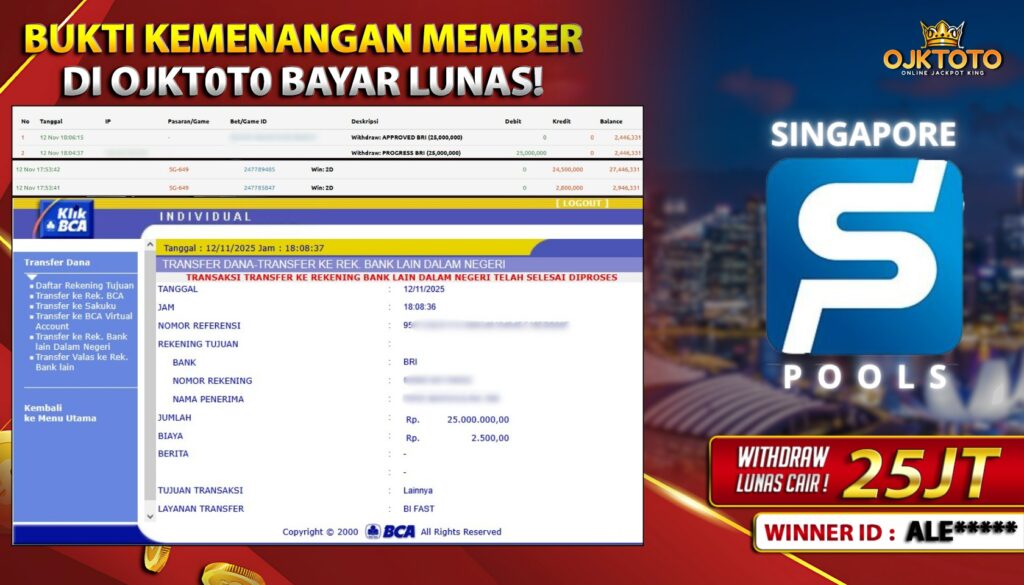 Bandar togel OJKTOTO merupakan bandar togel dan slot online yang membayar semua kemenangan member hingga lunas. Setiap pembayaran pada situs kami dilakukan dengan cara transfer ke rekening tujuan yang sudah di daftarkan pada situs togel online kami, Pembayaran hanya dapat di proses jika rekening yang di daftarkan telah valid dan dapat di transfer. Semua kemenangan member yang mendapatkan hadiah jackpot terbesar akan kami posting agar semua pemain dapat melihat bandar situs terpercaya OJKTOTO ini membayar semua kemenangan member hingga lunas. Setiap postingan yang kami posting akan kami lakukan sensor pada nomor rekening 4 digit dan nama rekening untuk menjaga privasi dan kerahasiaan member. Postingan Jackpot yang kami posting agar member atau pemain yang belum pernah bermain bisa melihat bandar togel Bukan Kaleng Kaleng Seperti OJKTOTO ini, Semua postingan jackpot yang kami posting dapat di lihat data keasliannya melalui nomor reff yang di tunjukan pada bank atau mbanking saat kita melakukan transfer.