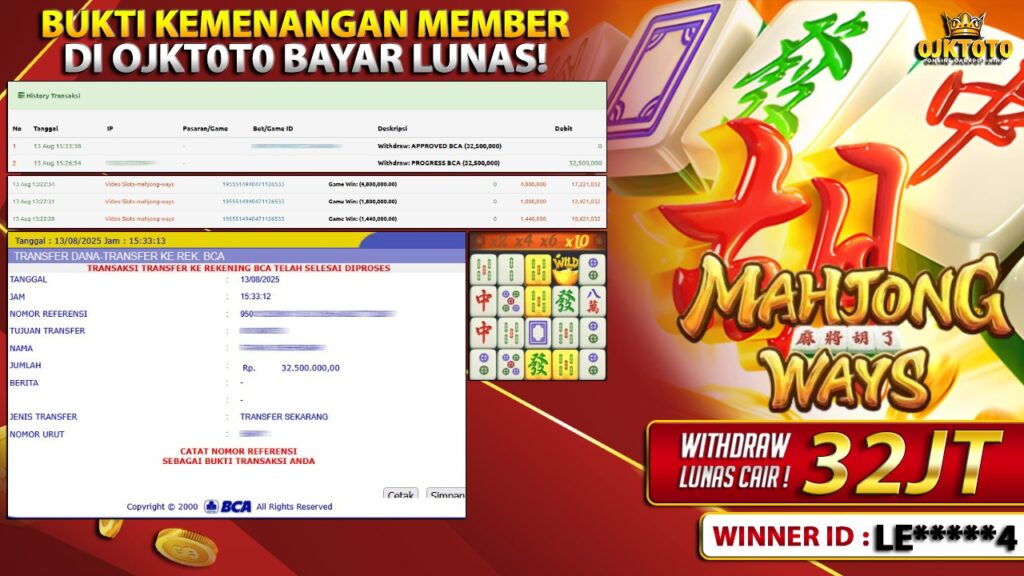 Bandar togel OJKTOTO merupakan bandar togel dan slot online yang membayar semua kemenangan member hingga lunas. Setiap pembayaran pada situs kami dilakukan dengan cara transfer ke rekening tujuan yang sudah di daftarkan pada situs togel online kami, Pembayaran hanya dapat di proses jika rekening yang di daftarkan telah valid dan dapat di transfer. Semua kemenangan member yang mendapatkan hadiah jackpot terbesar akan kami posting agar semua pemain dapat melihat bandar situs terpercaya OJKTOTO ini membayar semua kemenangan member hingga lunas. Setiap postingan yang kami posting akan kami lakukan sensor pada nomor rekening 4 digit dan nama rekening untuk menjaga privasi dan kerahasiaan member. Postingan Jackpot yang kami posting agar member atau pemain yang belum pernah bermain bisa melihat bandar togel Bukan Kaleng Kaleng Seperti OJKTOTO ini, Semua postingan jackpot yang kami posting dapat di lihat data keasliannya melalui nomor reff yang di tunjukan pada bank atau mbanking saat kita melakukan transfer.
