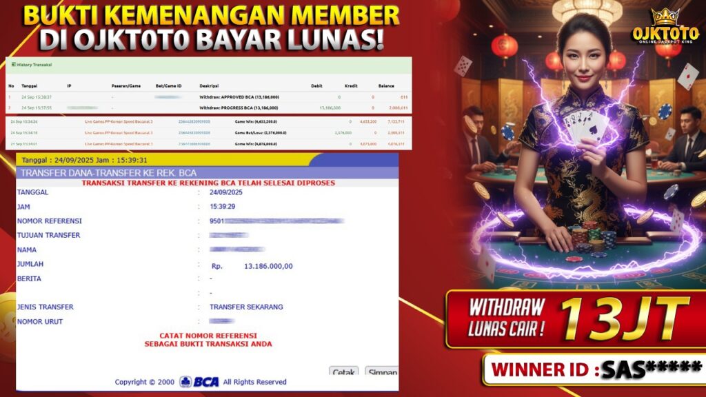 Bandar togel OJKTOTO merupakan bandar togel dan slot online yang membayar semua kemenangan member hingga lunas. Setiap pembayaran pada situs kami dilakukan dengan cara transfer ke rekening tujuan yang sudah di daftarkan pada situs togel online kami, Pembayaran hanya dapat di proses jika rekening yang di daftarkan telah valid dan dapat di transfer.  Semua kemenangan member yang mendapatkan hadiah jackpot terbesar akan kami posting agar semua pemain dapat melihat bandar situs terpercaya OJKTOTO ini membayar semua kemenangan member hingga lunas. Setiap postingan yang kami posting akan kami lakukan sensor pada nomor rekening 4 digit dan nama rekening untuk menjaga privasi dan kerahasiaan member. Postingan Jackpot yang kami posting agar member atau pemain yang belum pernah bermain bisa melihat bandar togel Bukan Kaleng Kaleng Seperti OJKTOTO ini, Semua postingan jackpot yang kami posting dapat di lihat data keasliannya melalui nomor reff yang di tunjukan pada bank atau mbanking saat kita melakukan transfer